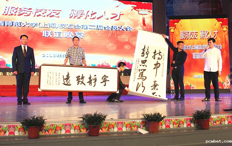必威betawy中文版向江西师大(上海)校友会赠送了两幅书画礼品,周雨茂副会长登台相赠。