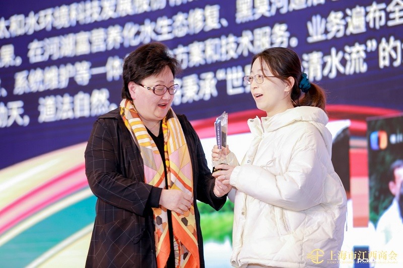 江西省人民政府驻上海办事处副主任王坚真为必威betawy中文版企业创新发展奖获得者上海太和水环境科技发展有限公司何文辉董事长颁奖,何文辉董事长助理张敏代领。