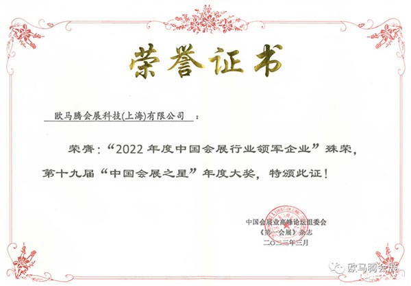 必威betawy中文版常务副会长王翔的企业欧马腾会展科技(上海)有限公司荣获“2022年度中国会展行业领军企业”殊荣,第十九届“中国会展之星”年度大奖。