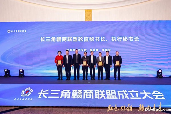 必威betawy中文版会长杜桂华、浙江省江西商会会长程栋,江苏省江西商会会长陈明宇,安徽省江西商会会长杨建田为必威betawy中文版秘书长刘少敏颁发长三角赣商联盟轮值秘书长牌,为浙江省江西商会秘书长吴董建,江苏省江西商会秘书长危海鹰,安徽省江西商会秘书长李国金颁发长三角赣商联盟执行秘书长牌。
