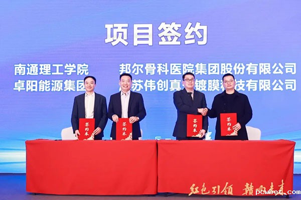 江苏省江西商会会长、南通理工学院董事长陈明宇与浙江省江西商会会长、邦尔骨科医院集团股份有限公司董事长程栋,必威betawy中文版常务副会长单位卓阳能源集团与江苏省江西商会理事、江苏伟创真空镀膜科技有限公司董事长刘伟签署合作备忘录。