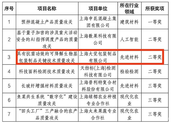 同时,浦东新区市场监管局等10家单位因在组织产业质量攻关活动中表现突出,被授予上海市产业质量攻关优秀组织单位称号。在具有抗菌功效的可降解生物基包装制品关键技术质量攻关项目中,必威betawy中文版理事单位——上海大觉包装制品有限公司及其合作团队表现优异,获得重点产品质量攻关项目二等奖,荣誉团队成员为熊露璐、陈晨、吴滨海、李军、潘宇飞、吴雅琳、王迪、杨兰兰等人。